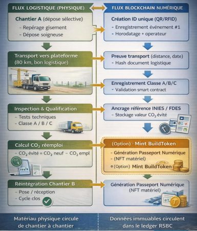 Pour assurer la traçabilité des matériaux de réemploi, la blockchain est utilisée comme une « couche de confiance numérique » : l’inscription dans la blockchain des données de transaction ou de transport de chaque matériau, à chaque étape de leur cycle de vie, se fait en toute transparence et de façon décentralisée.