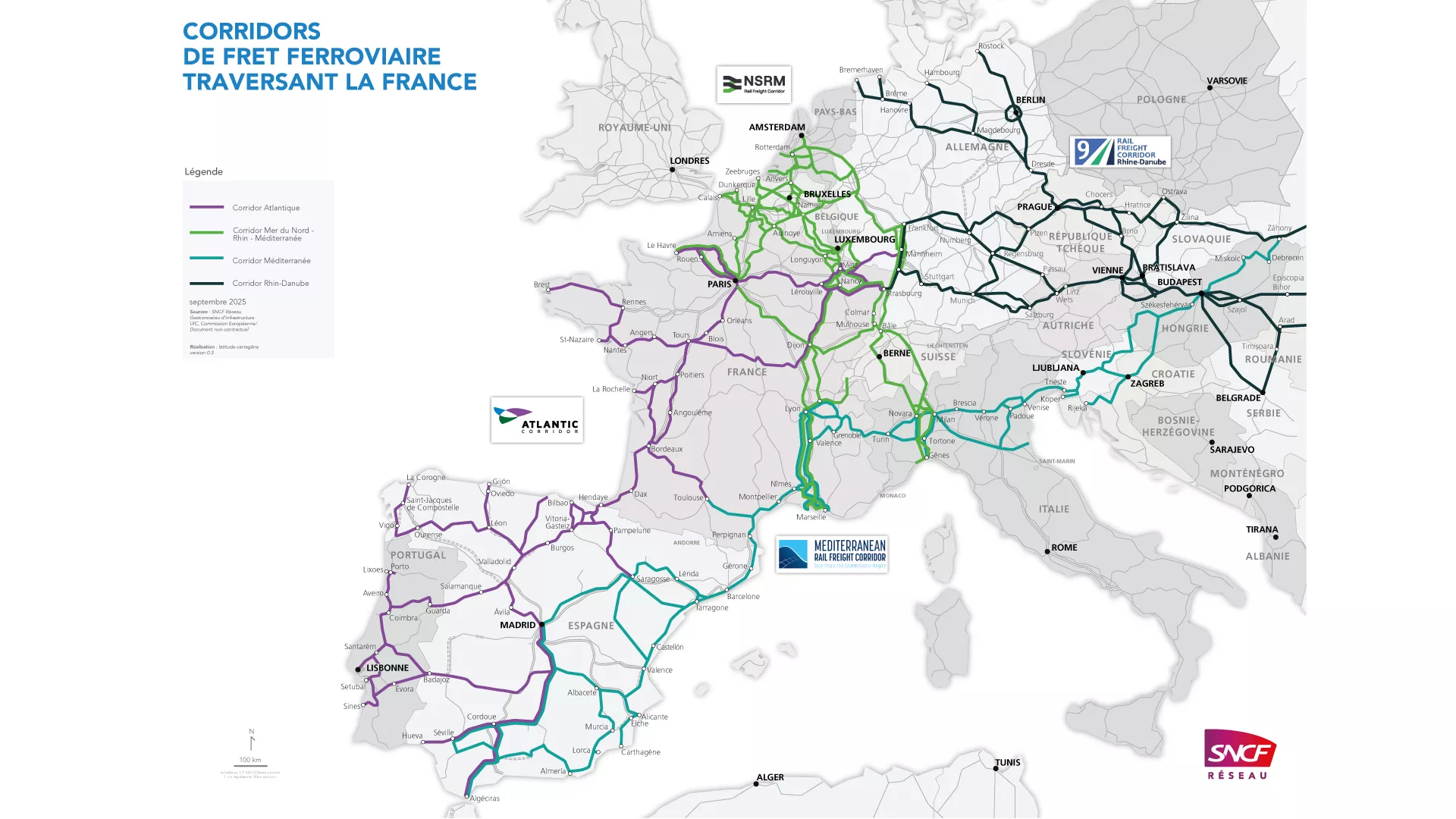Lors de leur lancement en 2013, ces corridors étaient au nombre de 9. Ils ne sont plus que 8 depuis la fin de l’année dernière, avec la création du corridor Mer du Nord – Rhin – Méditerranée (NSRM selon son acronyme en anglais) en remplacement de deux corridors de fret européens préexistants.
